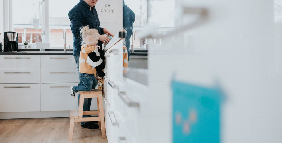 Ik ben nauwelijks de drempel over of ik krijg een knuffel voor mijn neus die, niet heel verrassend als je de knuffel ziet, panda blijkt te heten. Achter de panda staat kleine Lena van twee-en-een-beetje. Ik ben bij haar en papa Matthias en mama Maaike voor een paar uur 'Day in the life' foto's. Een van mijn grote favorieten als het om foto's gaat, dus ik was blij toen Maaike zei dat ze haar prijs die ze in de zomer won wel wilde gebruiken voor foto's bij hen thuis.